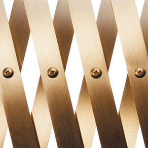 Das Scherengitter wird aus eloxierten Aluminiumstäben gefertigt. Deckenkasten und Gegengewicht sind pulverbeschichtet, Silber RAL 9006.